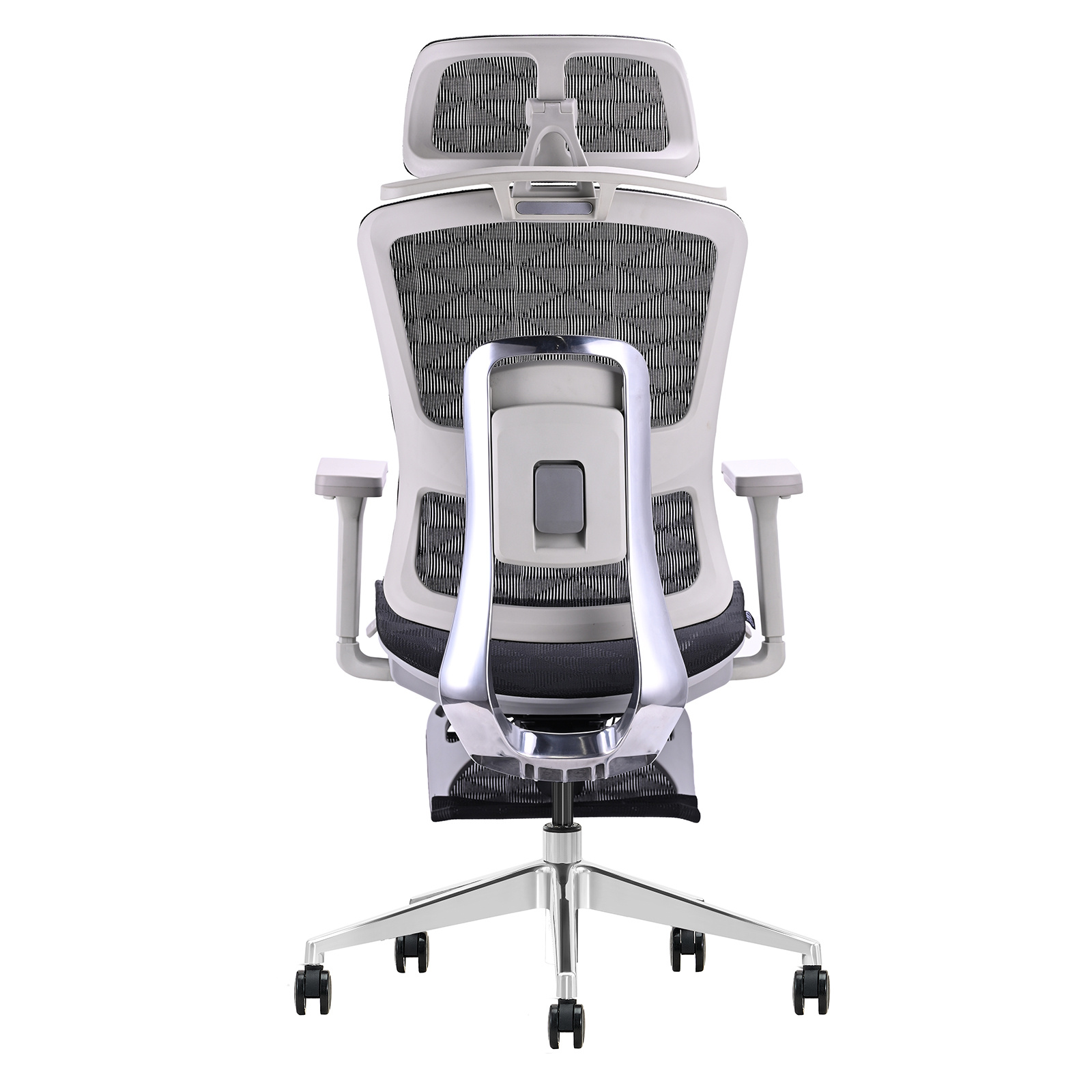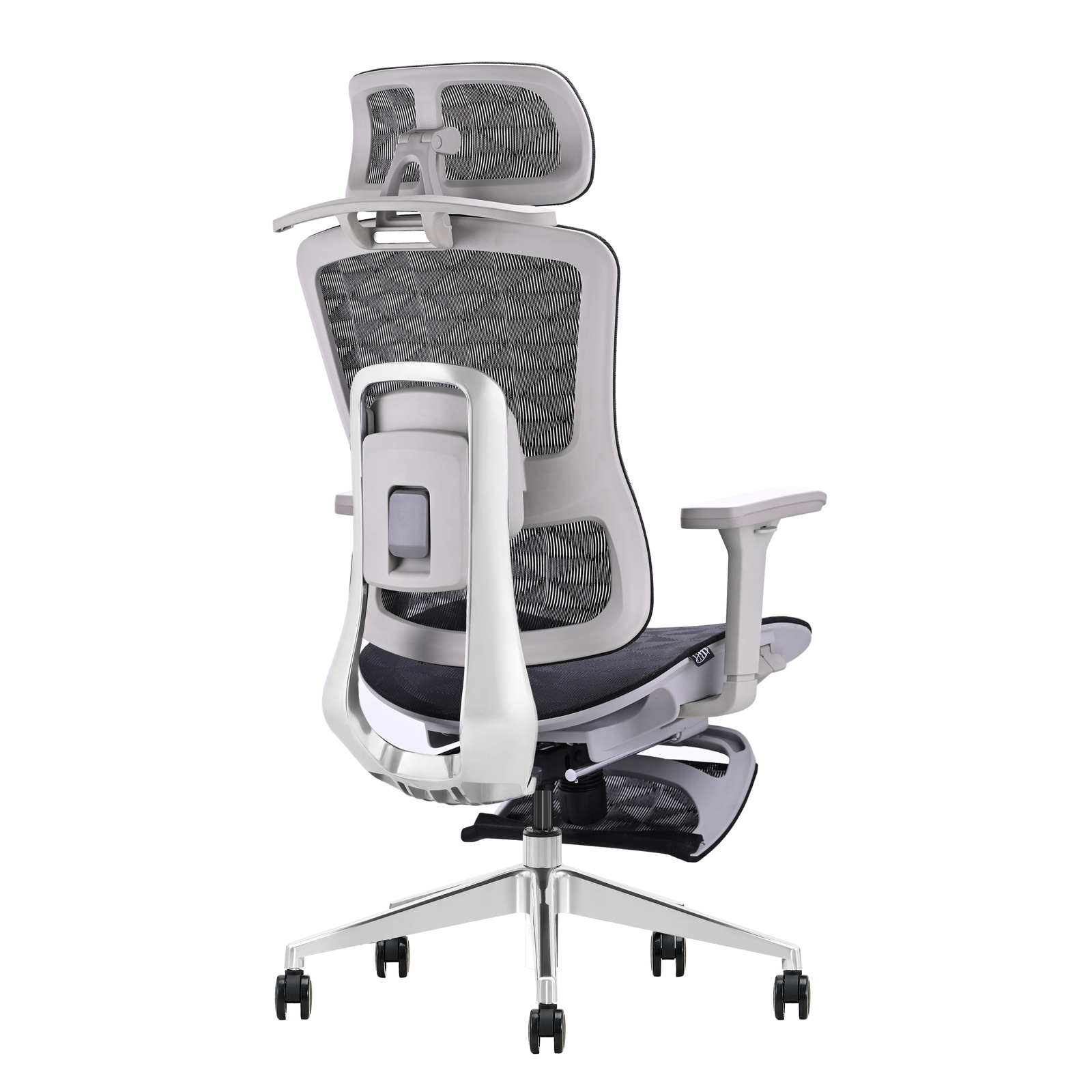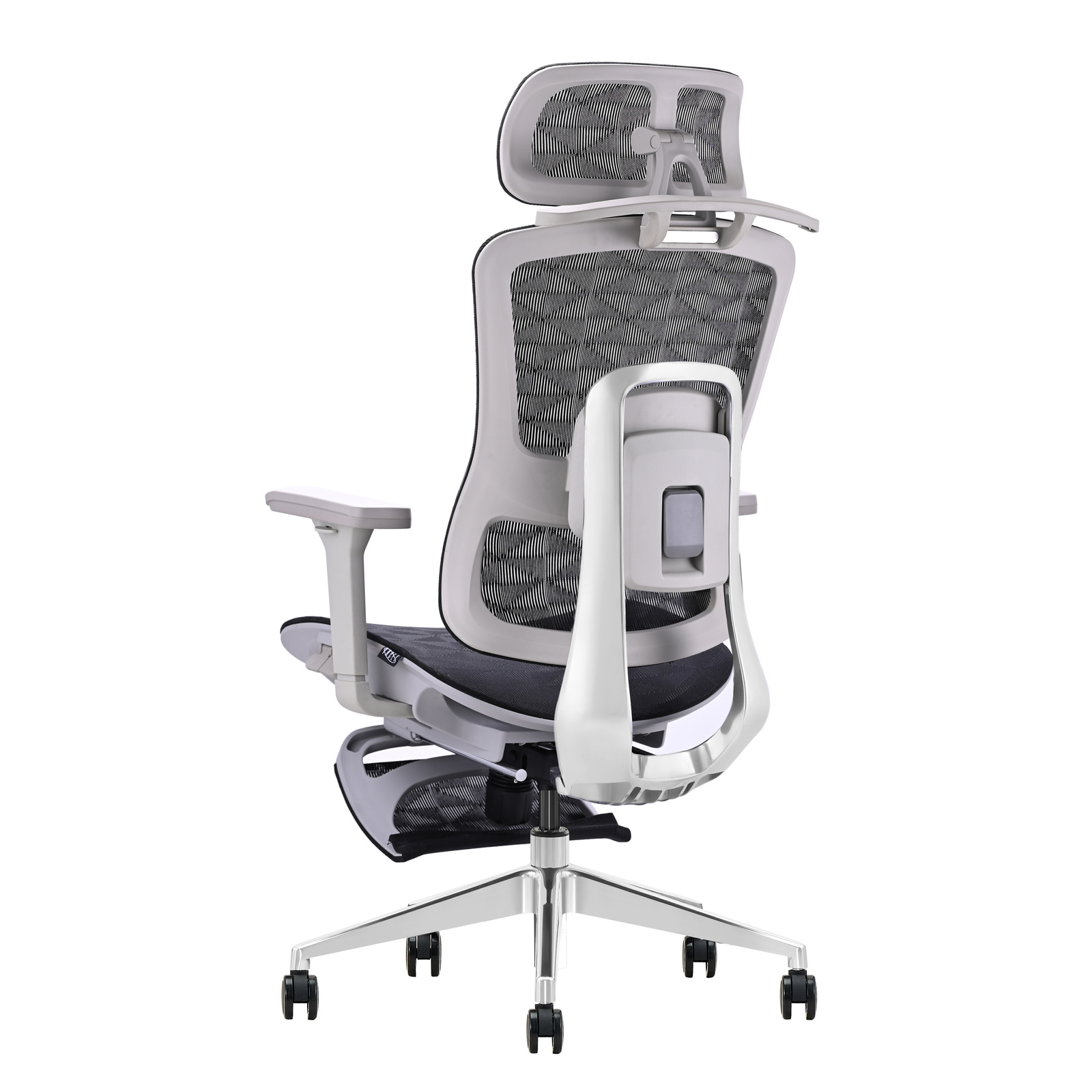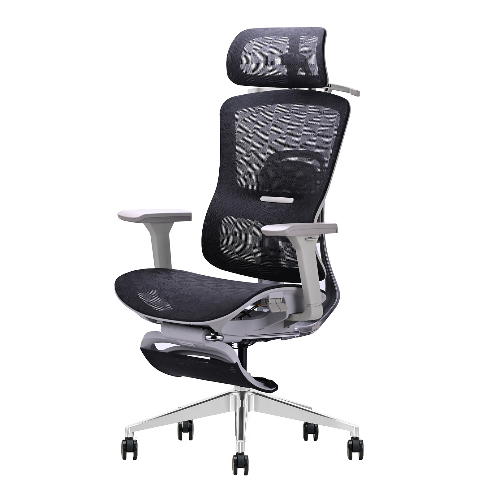 Homer w wykończeniu czarno-szarym łączy siatkowe oparcie i siedzisko, przesuwne siedzisko, podłokietniki 4D, zagłówek 2D oraz mechanizm MULTIBLOCK ELITE-SYNCHRO. Zaprojektowany do wygodnej pracy powyżej 4 h dziennie.