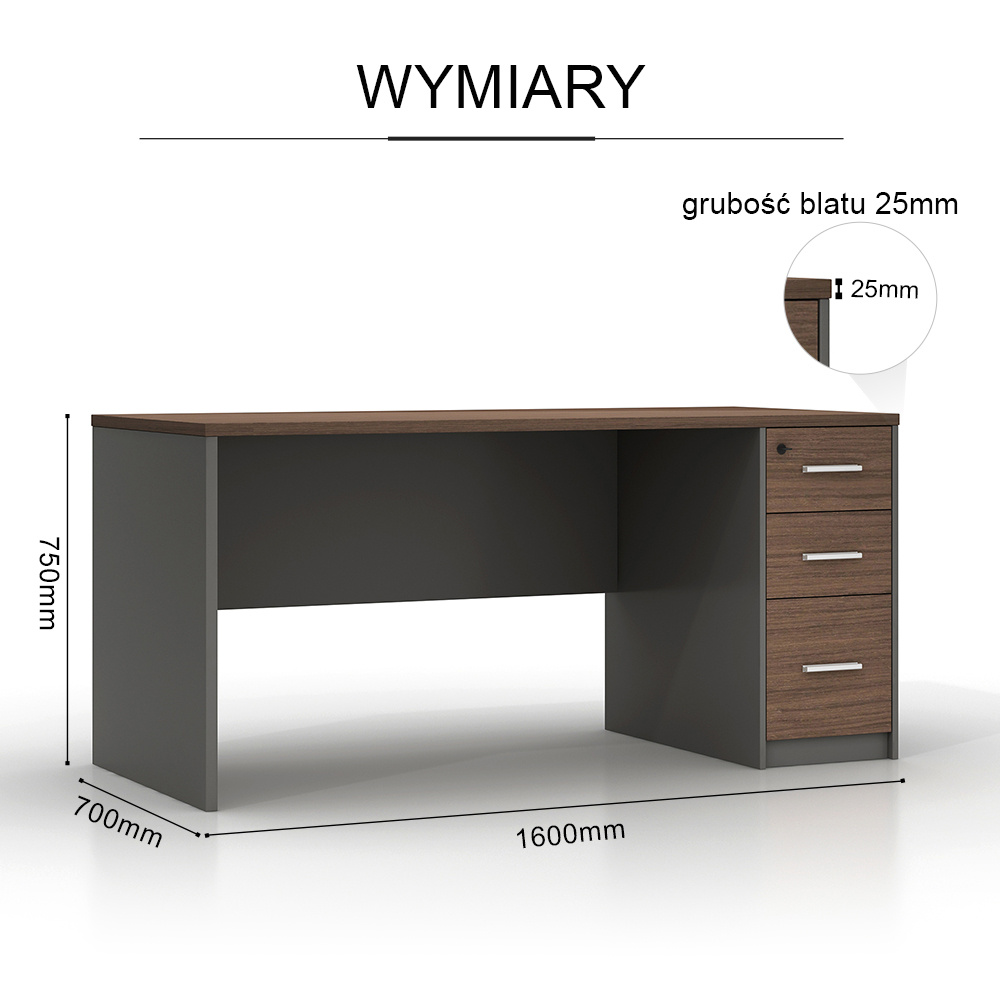 Stylowe, solidne i funkcjonalne biurko do biura i home office. Duży blat 160 × 70 cm zapewnia komfort pracy, a połączenie ciemnego dębu (teak) z matową szarością nadaje wnętrzu wyjątkowy charakter.