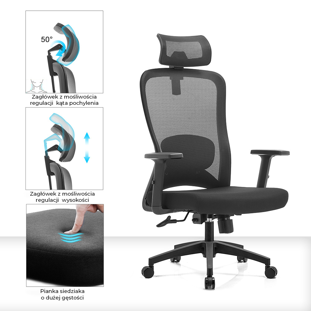 Wysokie oparcie z siatki zapewnia stałą cyrkulację powietrza. Solidna rama z tworzywa przeszła testy wytrzymałościowe. Podparcie lędźwi 2D pozwala precyzyjnie dopasować krzywiznę oparcia do Twoich pleców.