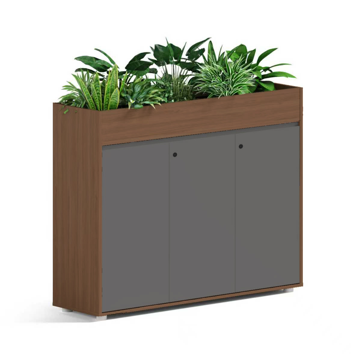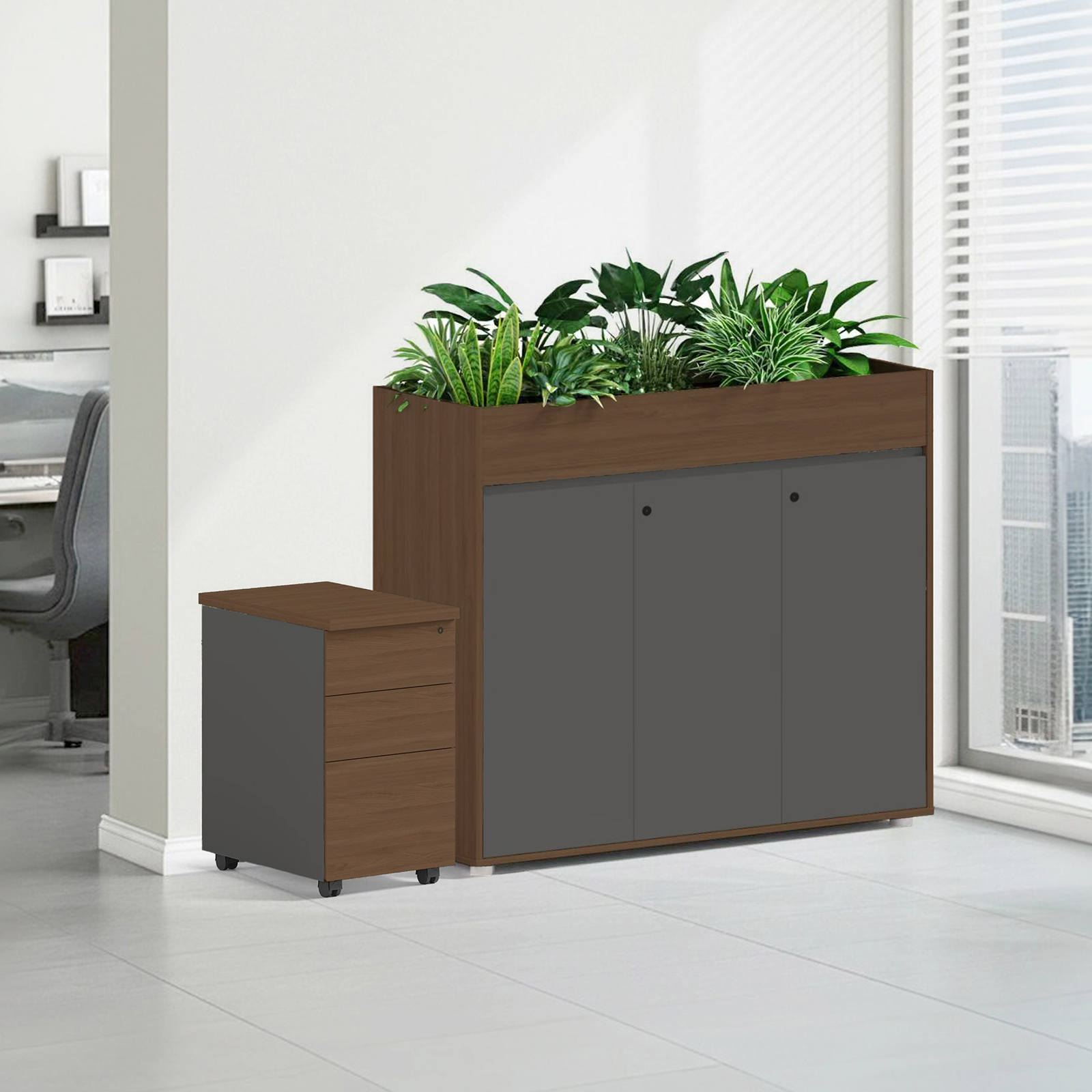 Wielofunkcyjny mebel do otwartych biur: górne koryto na rośliny oraz pojemna szafka poniżej. Zapewnia subtelną przegrodę między stanowiskami, porządkuje dokumenty i wprowadza do biura przyjazną, zieloną energię.