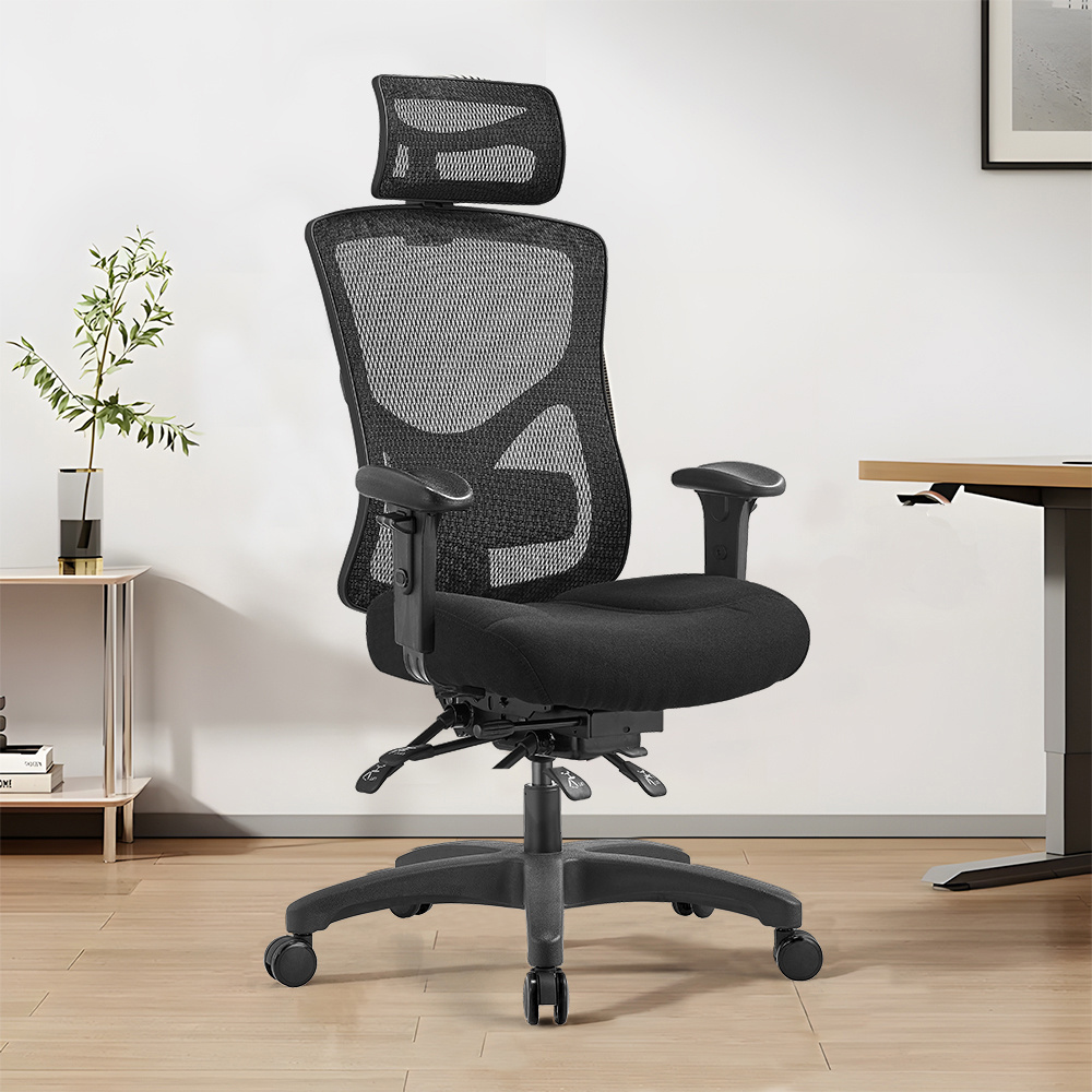 Oparcie w formie siatki wspiera przewiewność, a konstrukcja fotela zapewnia rozdział podparcia na strefy: szyja, plecy i lędźwie.